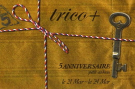 Date : 2009.4.21(tue)〜5.9(sat) Place : 紙の温度 (名古屋熱田) ![]() trico+ 5 ANNIVERSAIRE 『小さな贈り物展』 Date : 2007.3.21(thu)〜3.24(sun) Place : トリコ・プリュス (京都北白川) petit_cadeau開設中 |