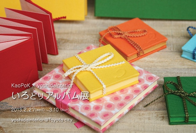 | 展示会 KaoPoK Bookbinding 10th Annivarsary 『10 colours 10の贈りもの』 Date: 2016.11.2(wed) - 6(sun) Place : Gallery blanka ギャラリーブランカ 10colours ギャラリー開設しました。 ![]() KaoPoK × yoshidainterior Exhibition 『いろどりアルバム展 IROdori album』 Date : 2013.2.27(wed)〜3.10(sun) Place : ヨシダインテリア yoshidainterior いろどりギャラリー開設中 ![]() Kaopok Bookbinding Exhibition 『KaoPoKの部屋』 Date : 2011.6.22(wed)〜7.4(mon) Place : Sablier de verrier サブリエ・ド・ヴェリエ (名古屋 覚王山) The chamber Galley 開設中 ![]() KaoPoK+yoshidainterior exhibition 『 おもいでのぉと展』 Date : 2009.2.19(thu)〜2.28(sat) Place : yoshidainterior ヨシダインテリア(豊田市) おもいでギャラリー開設中 inoui ∞ KaoPoK exhibition inoui + KaoPoK + emi takeuchi 『おとぎの国の雑貨店』 Date : 2006.9.13(wed)〜9.24(sun) Place : サブリエ・ド・ヴェリエ (覚王山) おとぎギャラリー開設中 ![]() |